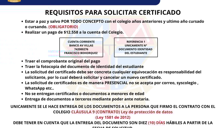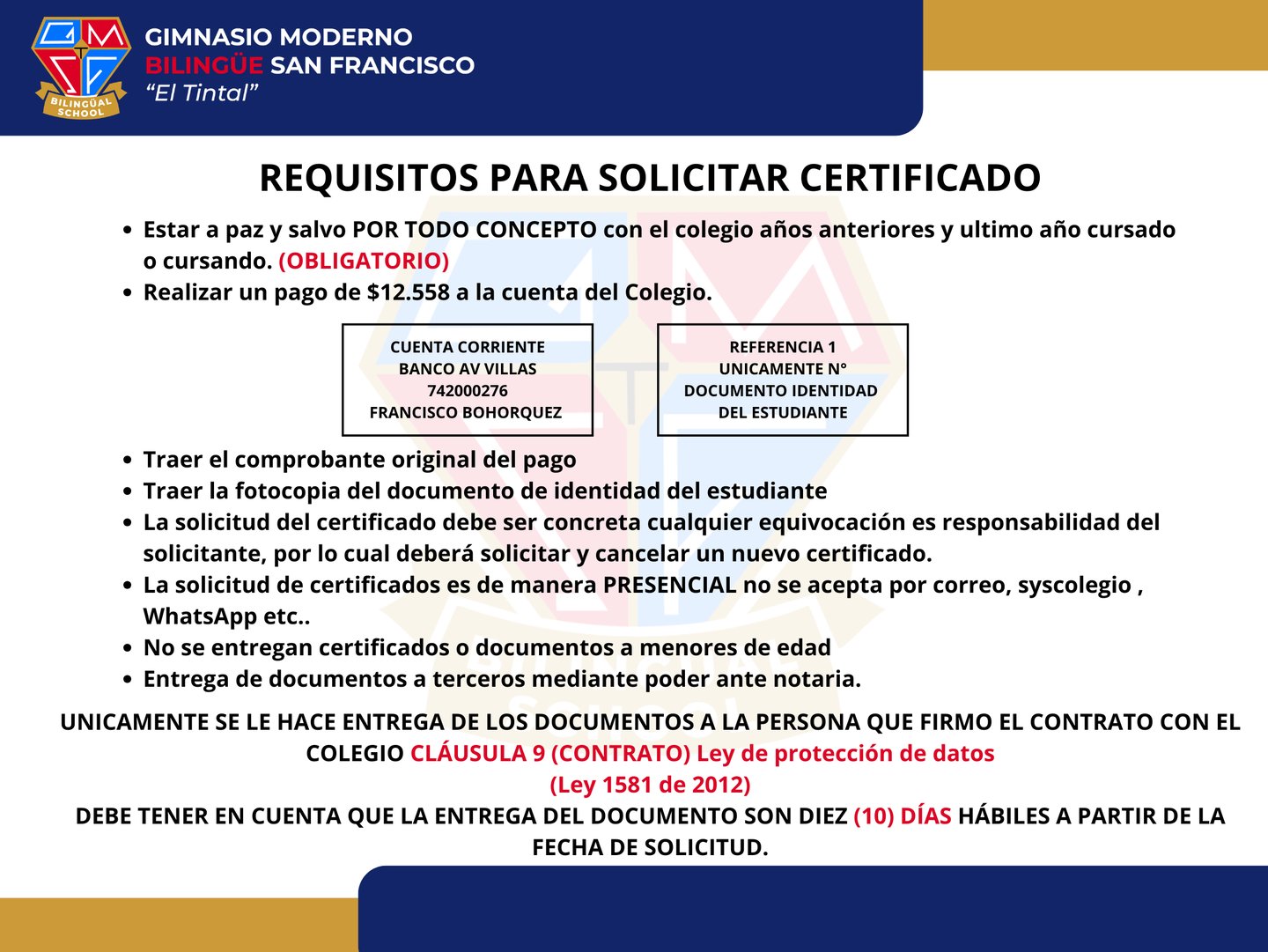 Es importa te tener en cuenta todos los requerimientos una vez se diligencie el respectivo formato de solicitud son 10 días hábiles para su entrega. En época de vacaciones no se entregan certificados ya que no hay atención de secretaria.